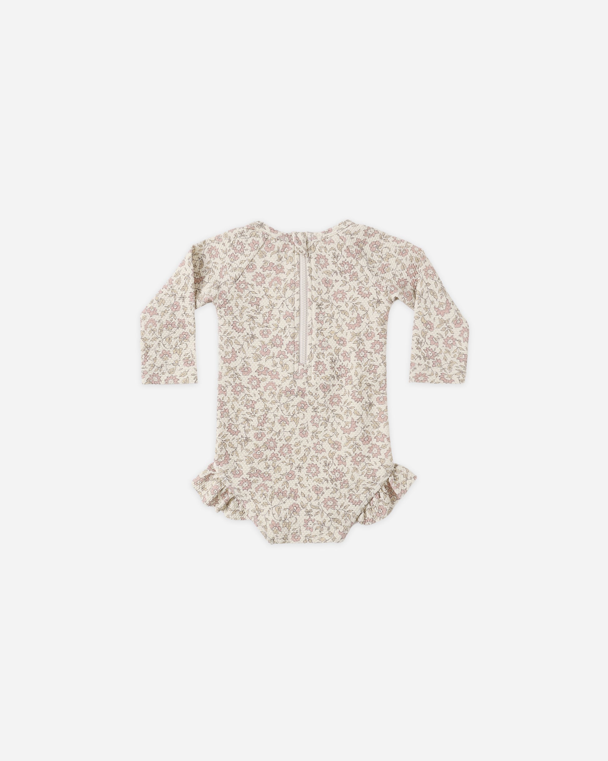 | This one-piece rashguard swimsuit will keep your little one protected from the sun in style. Featuring a back zip closure and ruffle detail at the leg openings. *Bottom snaps included on sizes 0-3M - 18-24m. UPF 50+ Featuring our ‘dahlia’ print on ‘natural’ hue - floral bunches come sweetly together for your little gals! Care: Machine wash cold on delicate. Hang dry. Made of 80% recycled polyester, 20% elastan |